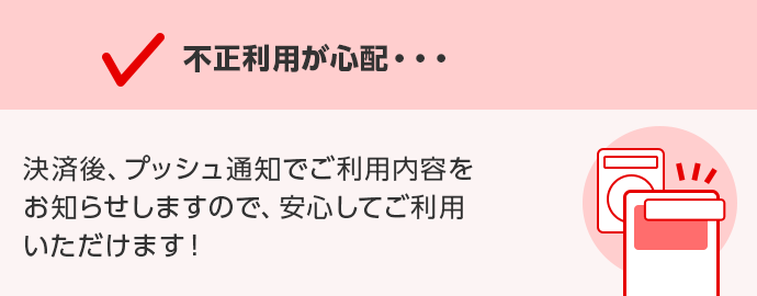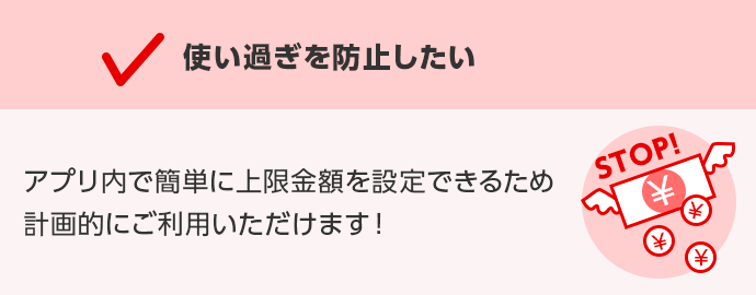 利用金額上限の設定をアプリから簡単に設定・変更が可能です。また、決済時のプッシュ通知機能もあり、安心・安全にご利用いただけます。