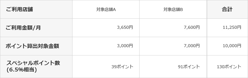 (例)対象店舗Aで月:2,800円、対象店舗Bで月:850円、対象店舗2店舗での合算ご利用金額/月:3,650円、スペシャルポイント還元率6.5%の場合