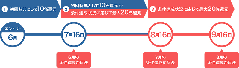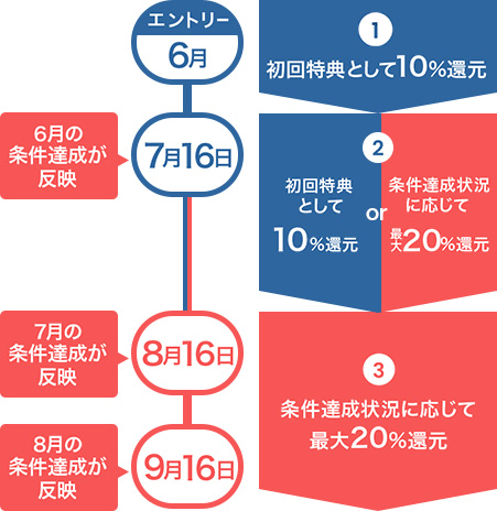 - ②エントリー月の翌月16日から翌々月15日までは、初回特典の10%と条件達成状況に応じた還元率(最大20%)のいずれか高い方が適用されます。