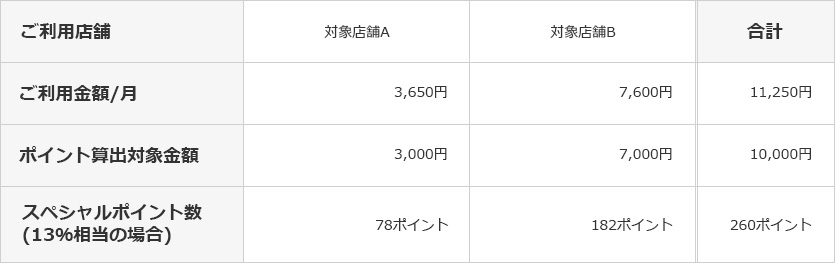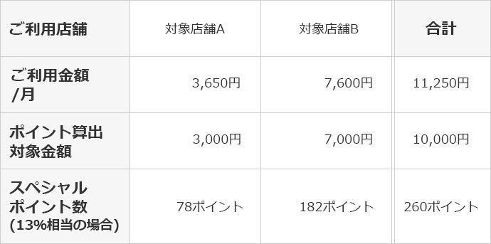 (例)対象店舗Aで月:2,800円、対象店舗Bで月:850円、対象店舗2店舗での合算ご利用金額/月:3,650円、スペシャルポイント還元率13%の場合