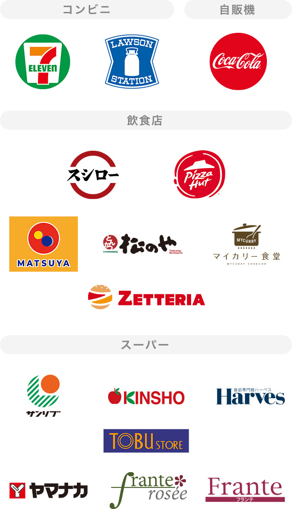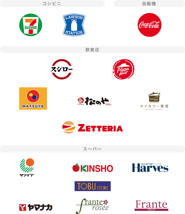 - 複合商業施設内にある店舗、駅などビル内の店舗、ガソリンスタンド併設店舗など、一部対象外となる場合がございます。