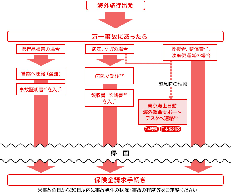 クレジットカードご利用の場合でも必要です。ただし、請求費用が30万円以下の場合は診断書は不要です。30万円以下のご請求であっても、ご請求内容により診断書のご提出を求める場合がございます。 - 緊急時のご相談は、「東京海上日動海外総合サポートデスク」(東京海上日動火災保険株式会社)へご連絡ください。お問い合わせ先は保険小冊子「カード付帯保険のご案」(PDF)にてご確認いただけます。