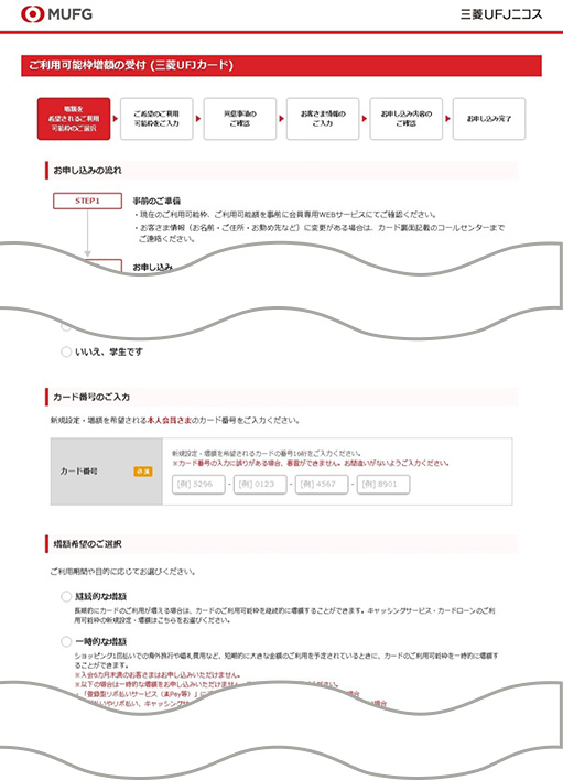 - 会員専用WEBサービス「My Digital Connect」内の「カードご利用可能枠の増額」より必要項目をご入力のうえ、お申し込みください。