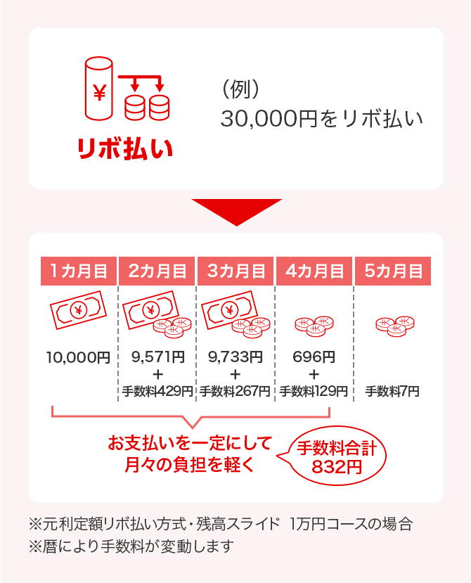 リボ払いのご利用残高によっては、リボ払い手数料がお支払いコースの毎月のお支払金額を上回る場合があります。