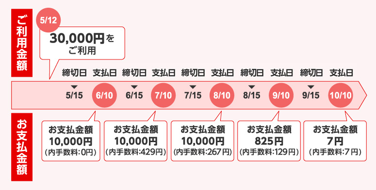 (弁済金)10,000円 10,000円 10,000円 825円 7円 元 金 10,000円 9,571円 9,733円 696円 0円 手数料 0円 429円(*1) 267円(*2) 129円(*3) 7円(*4) お支払後残高 20,000円 10,429円 696円 0円 0円 お支払総額 30,832円 - 手数料計算方法:[30,000円×25日(5/16~6/9)+20,000円×6日(6/10~6/15)]÷365日×18.00%=429円
