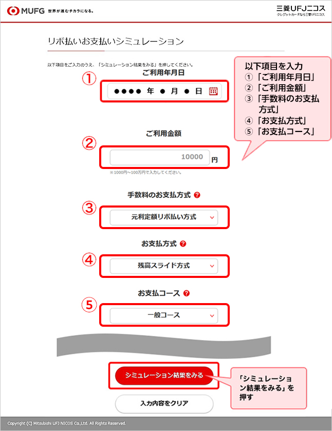 ご利用金額や手数料のお支払方式、お支払コースをご入力いただくと、手数料や月々のお支払金額をご確認いただけます。