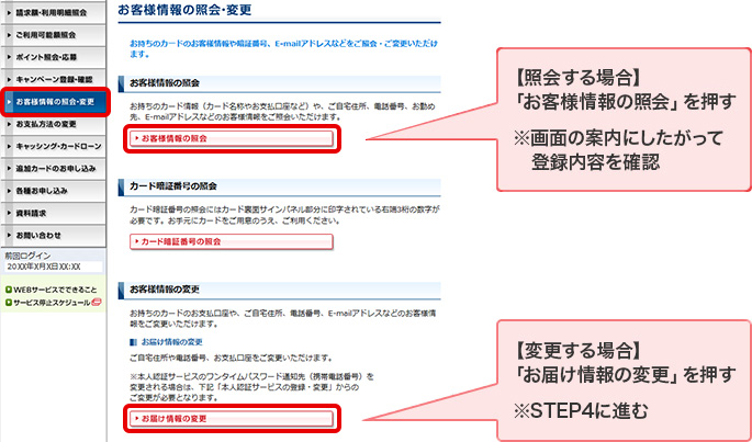 【照会する場合】 「お客様情報の照会」を押す ※画面の案内にしたがって登録内容を確認 【変更する場合】 「お届け情報の変更」を押す ※STEP4に進む