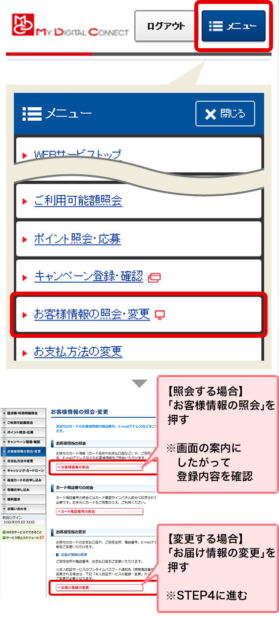 STEP 3. メニューの「お客様情報の照会・変更」を選択し、「お客様情報の照会」または「お届け情報の変更」を押す