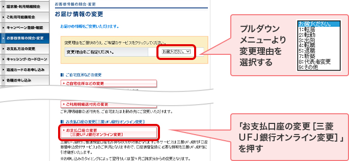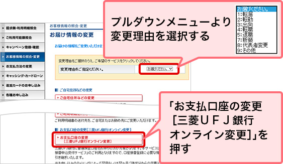 プルダウンメニューより変更理由を選択する 「お支払口座の変更[三菱UFJ銀行オンライン変更]」を押す