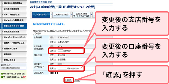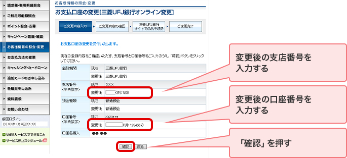 変更後の支店番号を入力する 変更後の口座番号を入力する 「確認」を押す