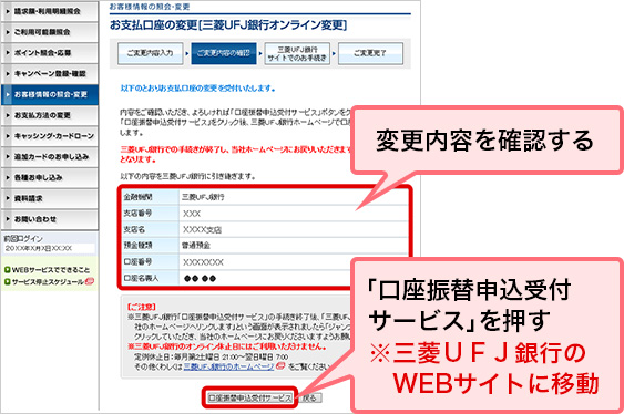 変更内容を確認する 「口座振替申込受付サービス」を押す ※三菱UFJ銀行のWEBサイトに移動