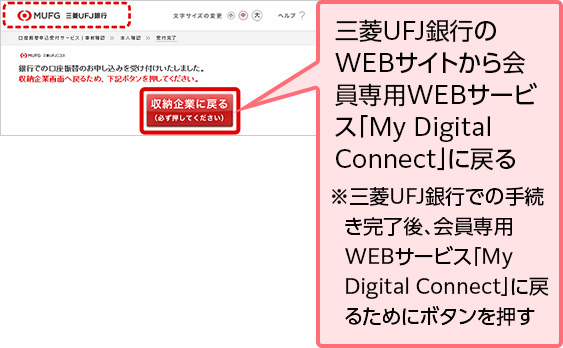 三菱UFJ銀行のWEBサイトから会員専用WEBサービス「My Digital Connect」に戻る ※三菱UFJ銀行での手続き完了後、会員専用WEBサービス「My Digital Connect」に戻るためのボタンを押す