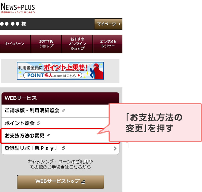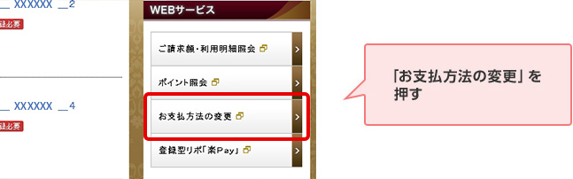 STEP 2. ログイン後、WEBサービスメニューの「お支払方法の変更」を押す