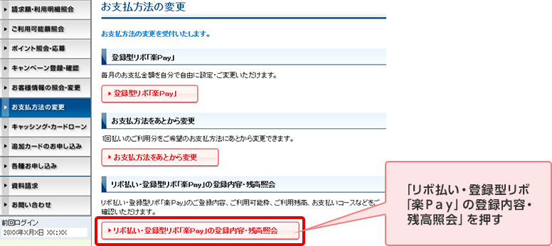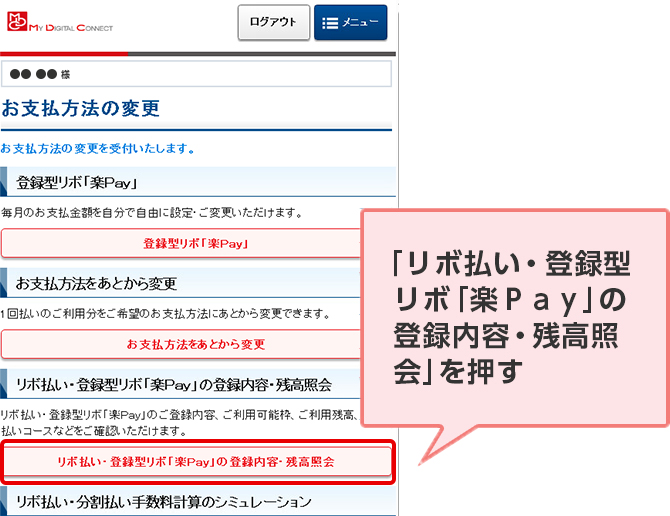 STEP 3. 「リボ払い・登録型リボ「楽Pay」の登録内容・残高照会」を押す