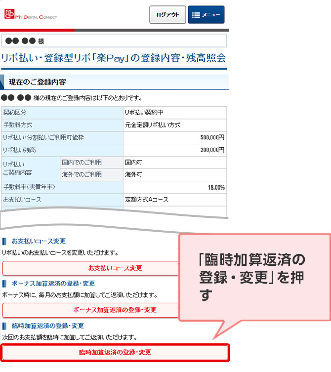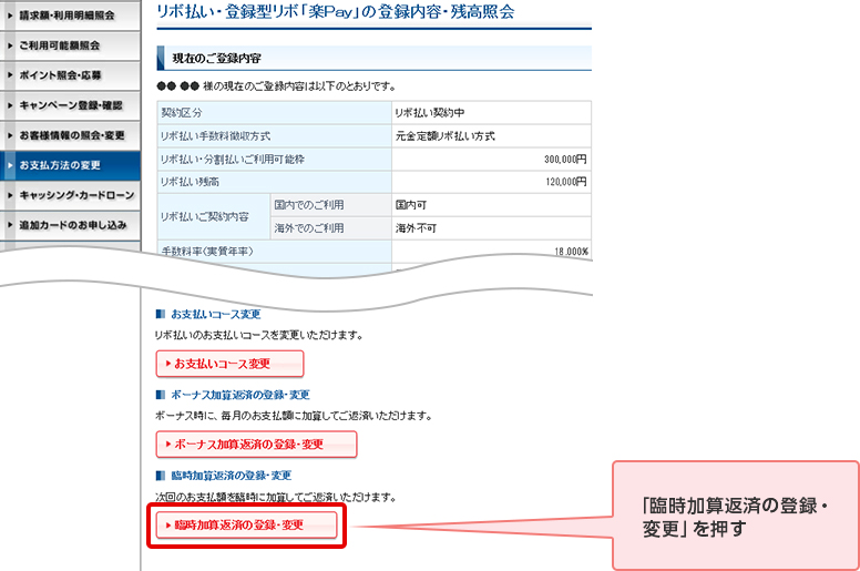 STEP 4. サービスメニューの「臨時加算返済の登録・変更」を押す
