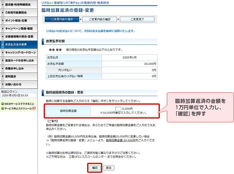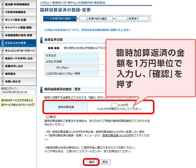 STEP 5. 臨時加算返済の金額を1万円単位で入力し、「確認」を押す