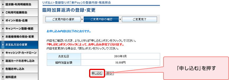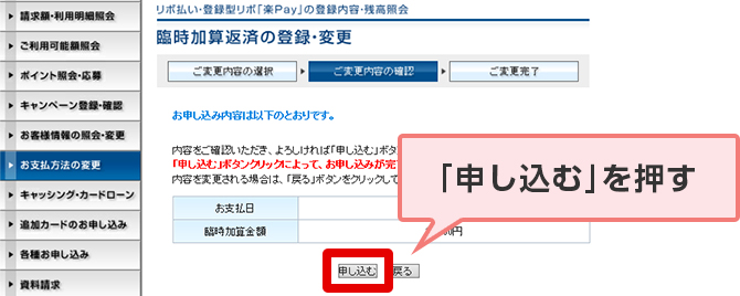 STEP 6. お支払日と臨時加算金額を確認のうえ、「申し込む」を押す