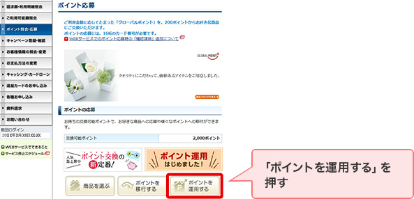 STEP 2. ログイン後、WEBサービスメニューの「ポイント照会」を押す