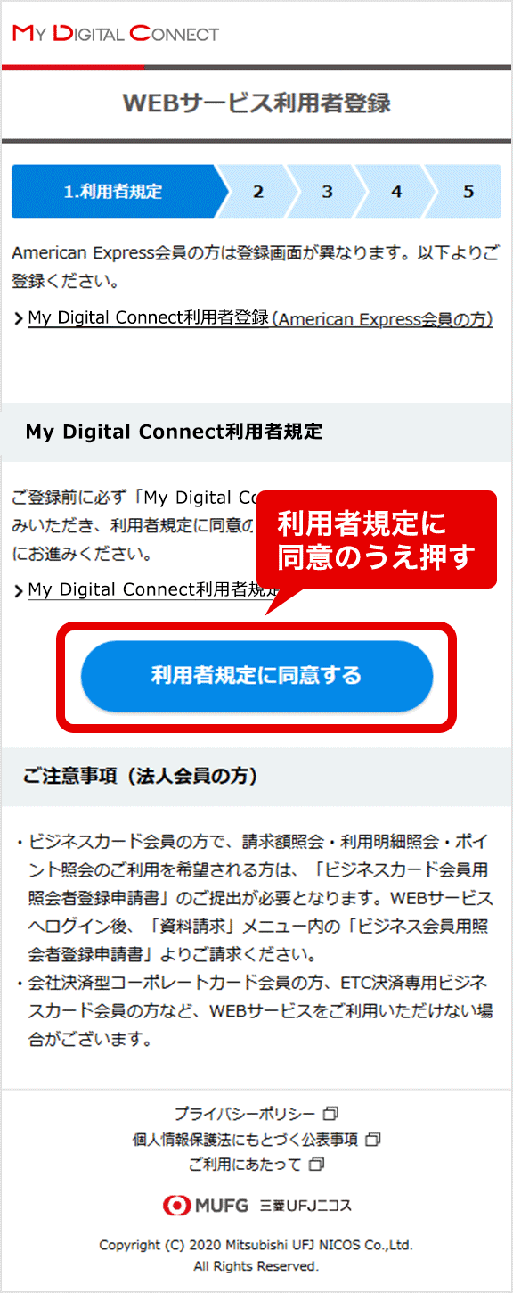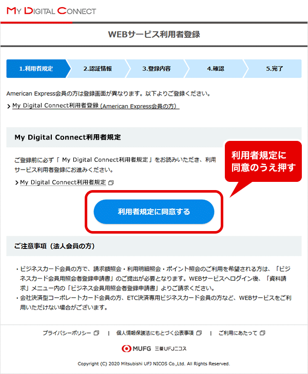 ご登録前に「利用者規定」をお読みいただき、利用者規定に同意のうえ、【利用者規定に同意する】ボタンを押してください。『認証情報』入力へ進みます。