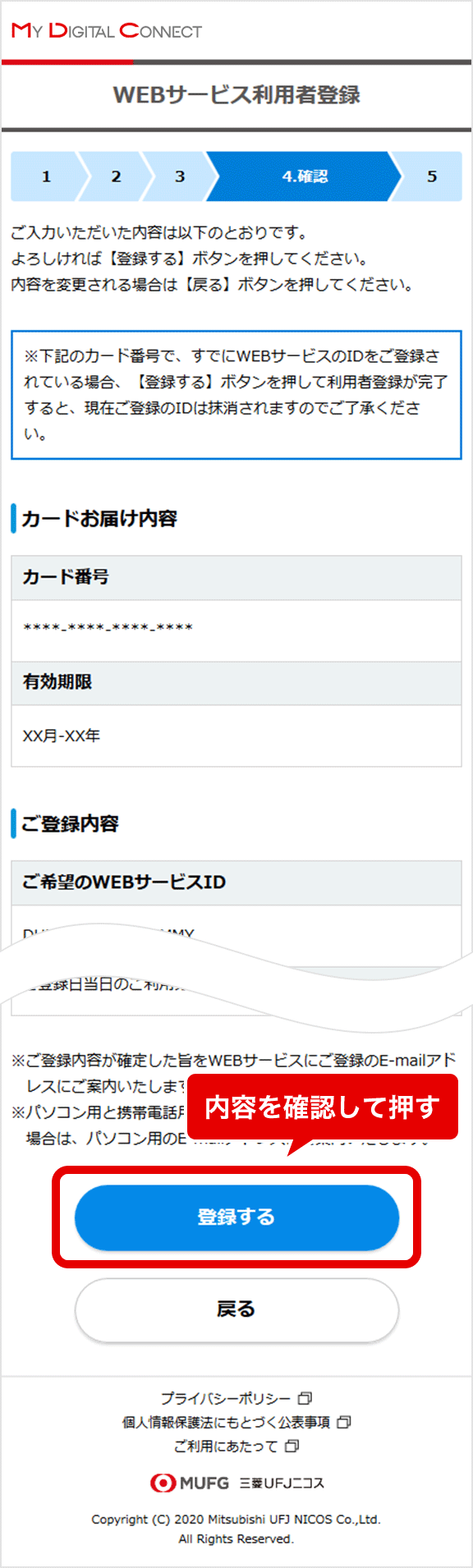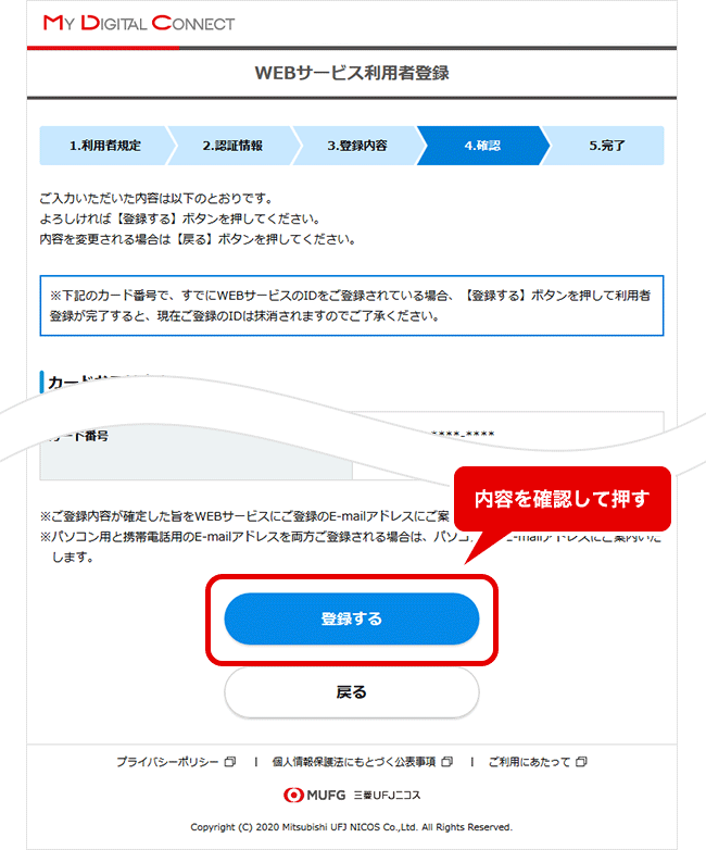 入力内容に間違いがなければ、【登録する】ボタンを押してください。『完了』画面に進みます。入力内容に修正が必要な場合は、【戻る】ボタンを押してください。