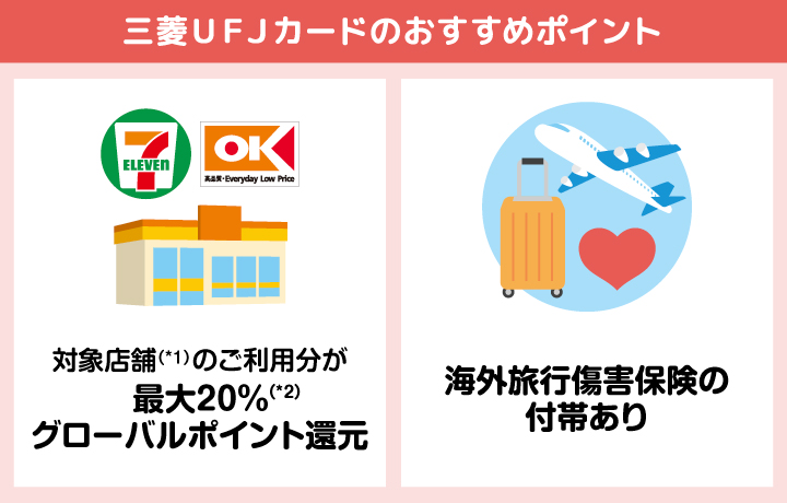 また、セブン‐イレブンやオーケーなどの対象店舗(*1)で三菱UFJカードを利用すると、ご利用分の最大20%(*2)相当のポイントが還元されます。