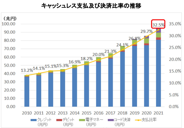 三菱UFJリサーチ&コンサルティングの「キャッシュレス決済の動向整理」(2022年9月)によると、クレジットカードやデビットカード、電子マネー、コード決済をまとめたキャッシュレス決済の比率は、2010年時点では13.2%だったのに対し、2021年時点では32.5%となり、年々増加していることがわかります。