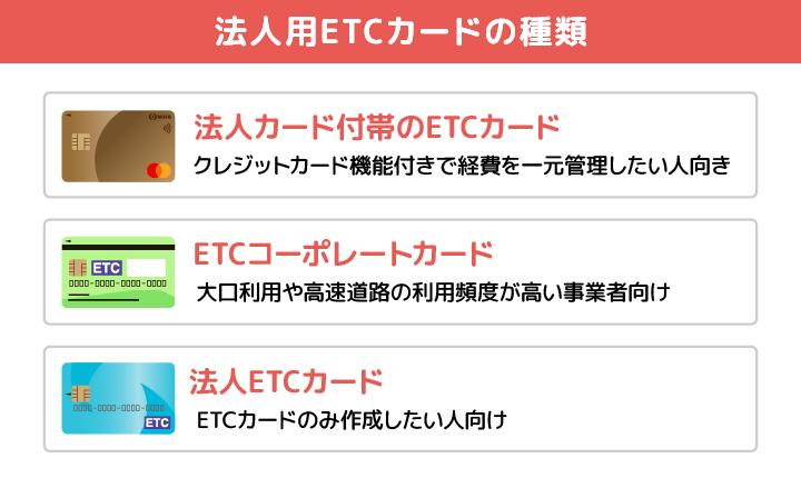 - 法人用ETCカードとは、法人名義や個人事業主名義で契約したETCカードのことです。法人用ETCカードと呼ばれていますが、個人事業主が持てるものもあります。なお、法人用ETCカードは、法人カード付帯のETCカード、ETCコーポレートカード、ETC協同組合や高速情報協同組合が発行する法人ETCカードの3種類があります。