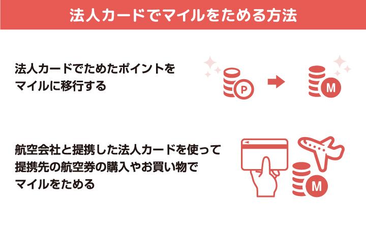 - 法人カードでは、ご利用金額に応じてたまったポイントをマイルに移行するほか、航空会社と提携している法人カードで提携先の航空券を購入したり、お買い物で利用したりするとマイルがためられます。また、法人カードによっては、航空券を法人カードで決済して、飛行機に乗るとフライトマイルがもらえます。