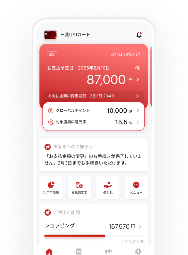 三菱UFJニコスの三菱UFJカードなら、MDCアプリと連携させることで月ごとのご利用明細の確認や、利用状況の確認が簡単にできます。また、アプリ上で、分割払いやリボ払いに変更することも可能です。