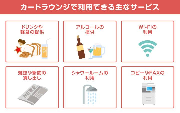 詳しくは「カードラウンジで提供されるサービス内容は?」をご確認ください。 - カードラウンジの利用方法は?