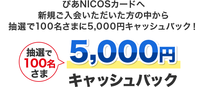 - ・キャッシュバック時期までにぴあNICOSカードをご退会されている場合やカード利用停止、会員資格取り消し事項に該当する場合はキャッシュバックの対象となりません。