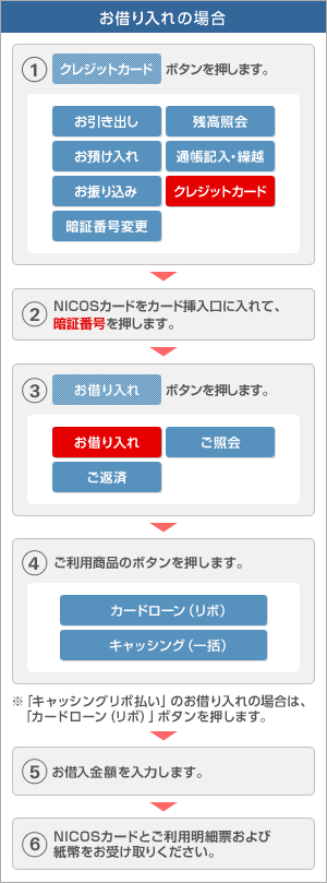 - 21:00~24:00の間は、ATMでのキャッシングリボ払いのご返済がご利用いただけません。(ただし、毎月13日と月末はショッピングリボ払いもご利用いただけません。)