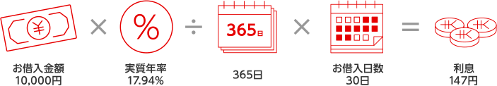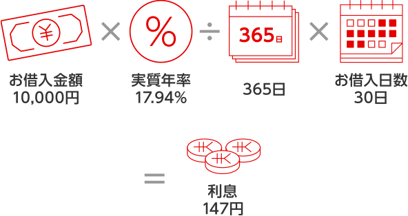 ※実質年率17.94%で、10,000円を30日間お借り入れの場合