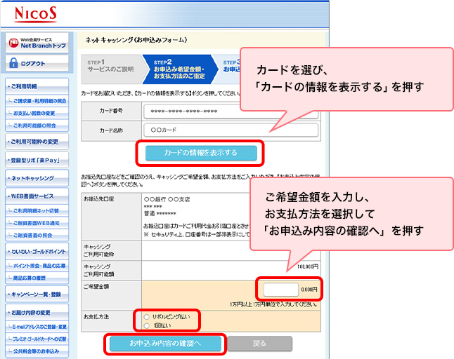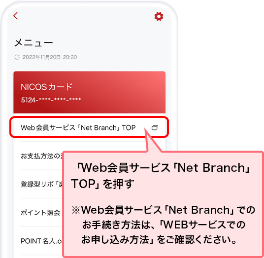 NICOSカードアプリよりWeb会員サービス「Net Branch」へログイン後、お借り入れのお手続きが可能です。