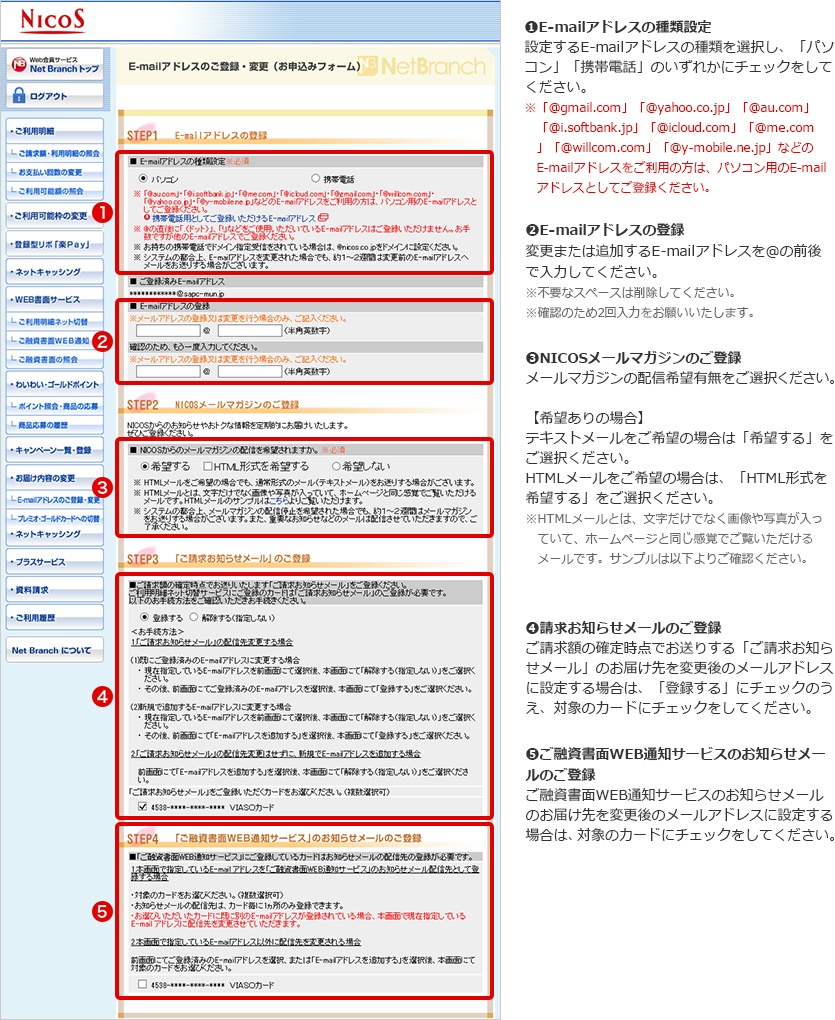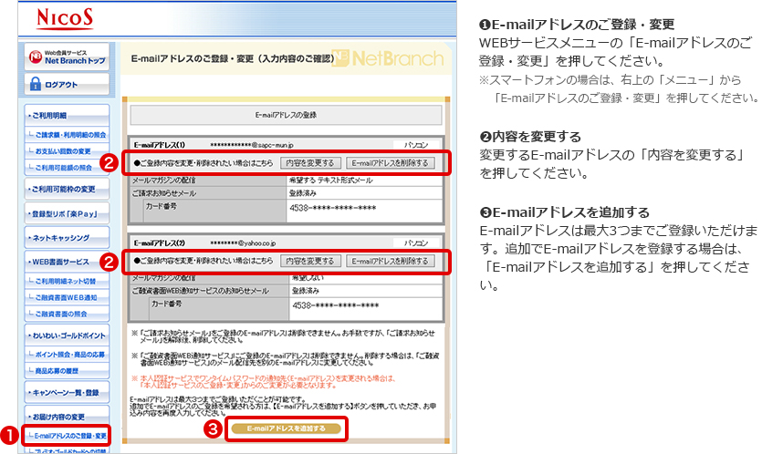 STEP1. 「E-mailアドレスのご登録・変更」にて、「内容を変更する」を押す