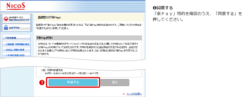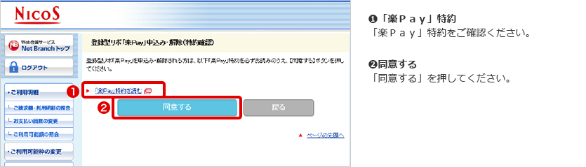 STEP3. 「楽Pay」特約を確認のうえ、「同意する」を押す
