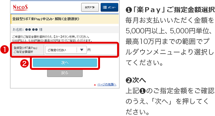 STEP4. 「楽Pay」ご指定金額を選択のうえ、「次へ」を押す