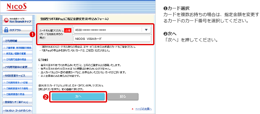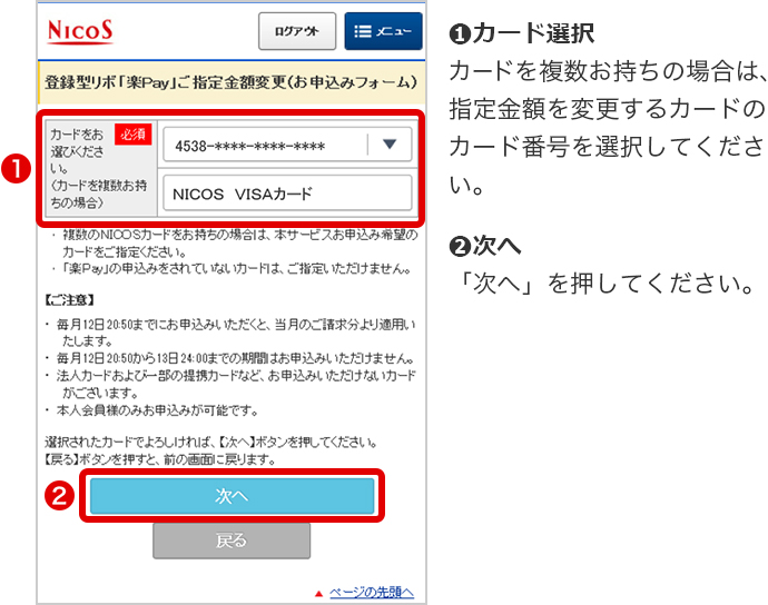 STEP2. 指定金額を変更するカードを選択のうえ、「次へ」を押す
