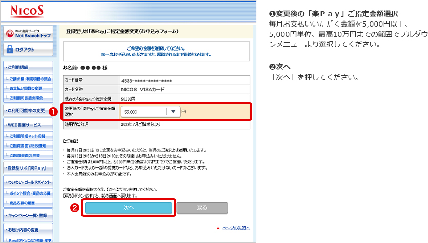 STEP1. 「登録型リボ『楽Pay』」にて「ご指定金額変更」を押す