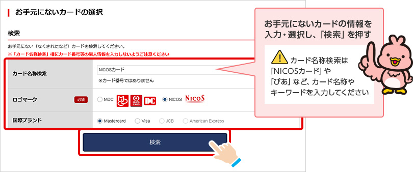 お手元にないカードの情報を入力・選択し、「検索」を押す カード名称検索は「NICOSカード」や「ぴあ」など、カード名称やキーワードを入力してください お手元にないカードの情報を入力・選択し、「検索」を押す カード名称検索は「NICOSカード」や「ぴあ」など、カード名称やキーワードを入力してください