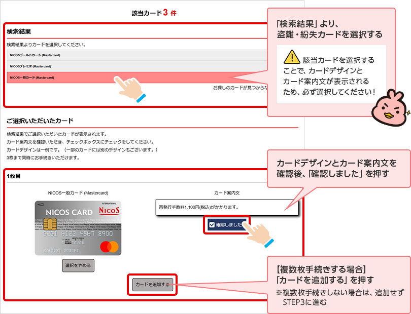 「検索結果」より、盗難・紛失カードを選択する 該当カードを選択することで、カードデザインとカード案内文が表示されるため、必ず選択してください! カードデザインとカード案内文を確認後、「確認しました」を押す 【複数枚手続きする場合】「カードを追加する」を押す ※複数枚手続きしない場合は、追加せず STEP3に進む 「検索結果」より、盗難・紛失カードを選択する 該当カードを選択することで、カードデザインとカード案内文が表示されるため、必ず選択してください! カードデザインとカード案内文を確認後、「確認しました」を押す 【複数枚手続きする場合】「カードを追加する」を押す ※複数枚手続きしない場合は、追加せず STEP3に進む