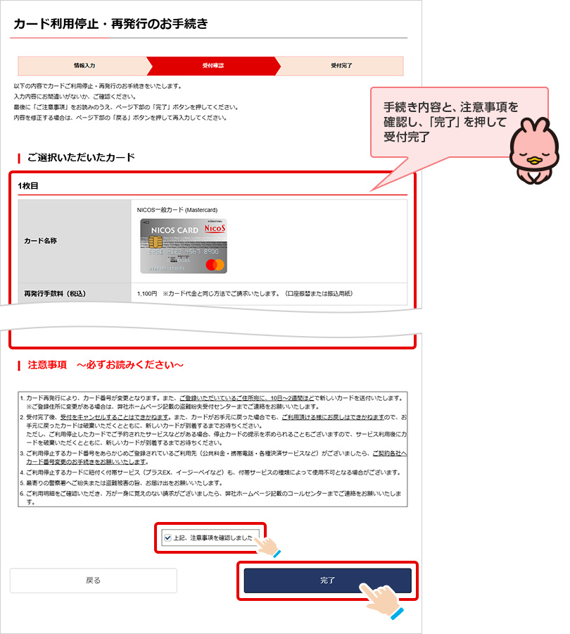 手続き内容と、注意事項を確認し、「完了」を押して受付完了 手続き内容と、注意事項を確認し、「完了」を押して受付完了