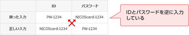 誤ってID入力欄にパスワード、パスワード入力欄にIDを入力しているケースがございます。ID・パスワードの入力欄をお間違いないようにご入力ください。