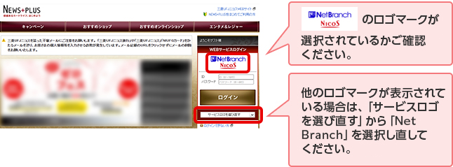 他のロゴマークが表示されている場合は、「サービスロゴを選び直す」からNICOS(Net Branch)を選択のうえ、再度ログインをお試しください。