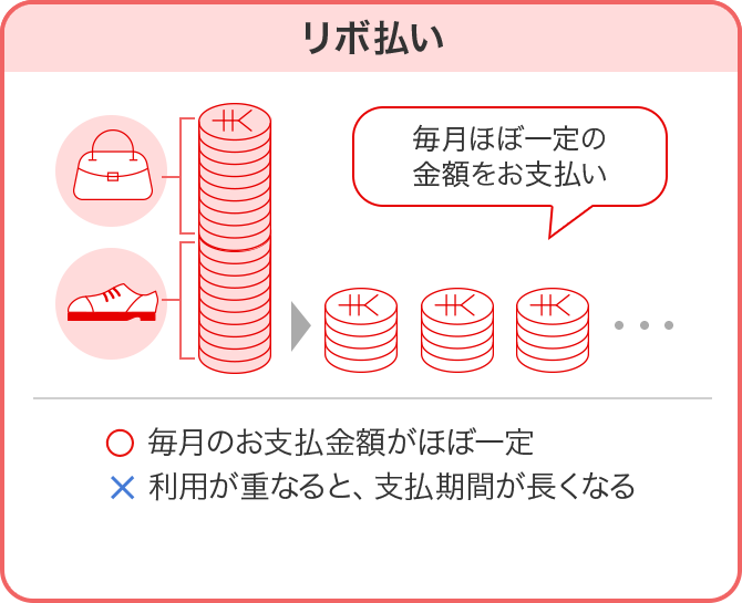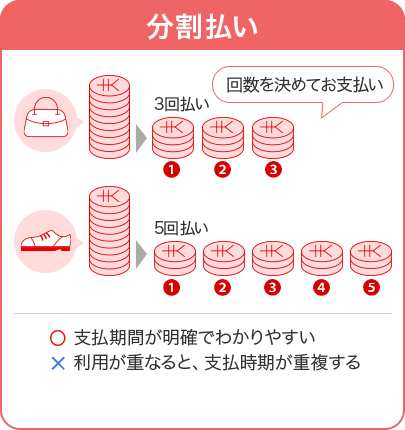 「分割払い」は回数を決めてお支払い、「リボ払い」は毎月ほぼ一定の金額をお支払いする方法となります。