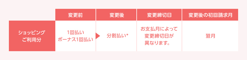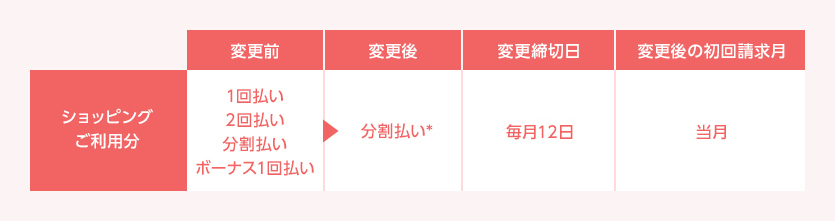 毎月12日までのお申し込みで、ご請求確定前のカードご利用分のお支払方法を変更できます。