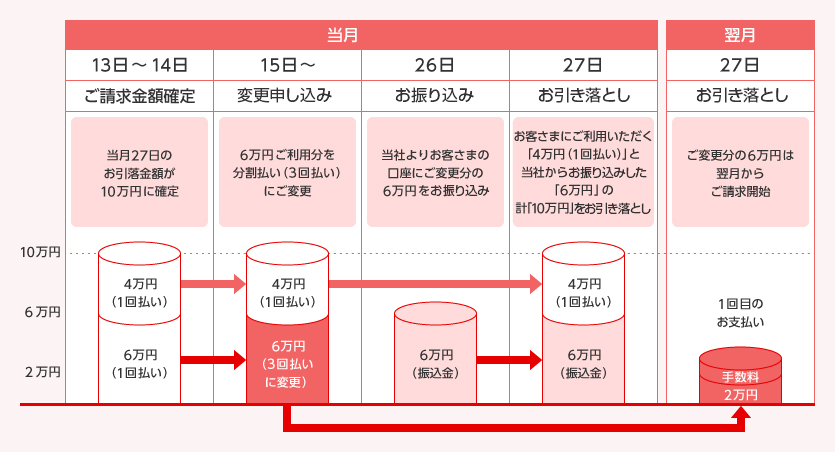 ご請求金額10万円【「4万円(1回払い)」+「6万円(1回払い)」】のうち、「6万円(1回払い)」をお支払月15日以降に分割払い(3回払い)に変更した場合