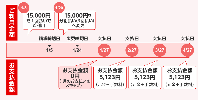 「1回払い」「2回払い」「分割払い」「ボーナス1回払い」のご利用分を分割払いに変更することで、次回のお支払金額を減らすことができます。