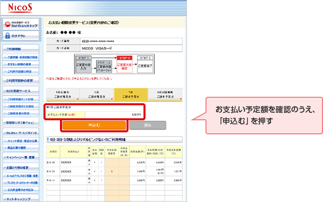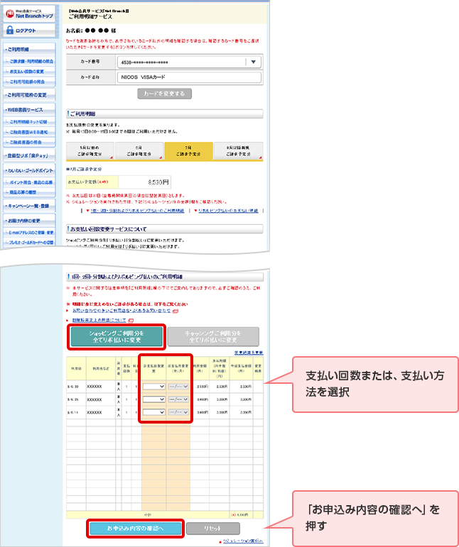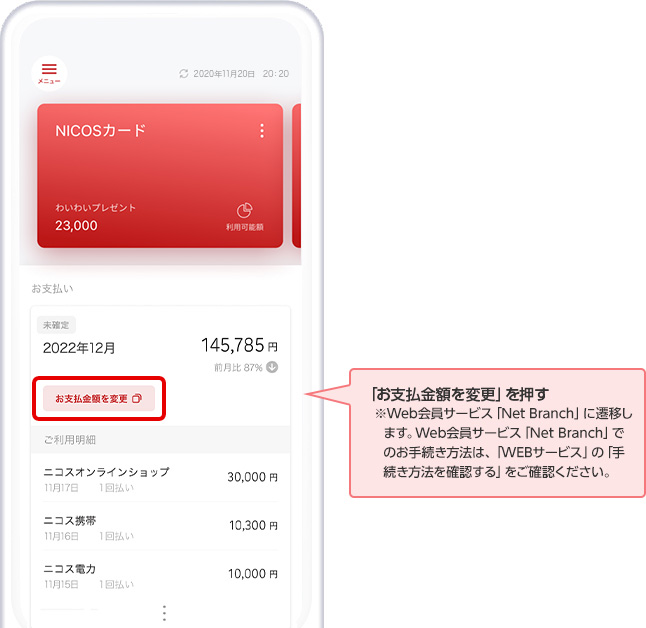 NICOSカードアプリよりWeb会員サービス「Net Branch」へログイン後「お支払い回数の変更サービス」へのお申し込みが可能です。