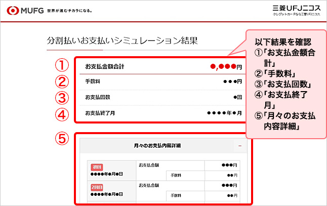 ご利用金額やお支払回数をご入力いただくと、手数料や月々のお支払金額をご確認いただけます。